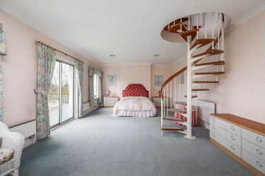 As can be seen from the photographs, the grandeur of the house continues on the first floor as there was plentiful space for the owners to house a grand piano. The principal bedroom suite is an absolute triumph, with a 26’ bedroom leading to a vast dressing room which in turn leads to a large en-suite bathroom. Should such a sizeable bedroom be surplus to requirements, this suite could be rearranged to introduce a fifth bedroom to the property. There are two further double bedrooms on this level, one with the benefit of a private en-suite and the other with its own bathroom. A spiral staircase rises to the top floor where there is another bedroom with balcony and sauna and further steps lead to an enclosed roof terrace which has far reaching views.