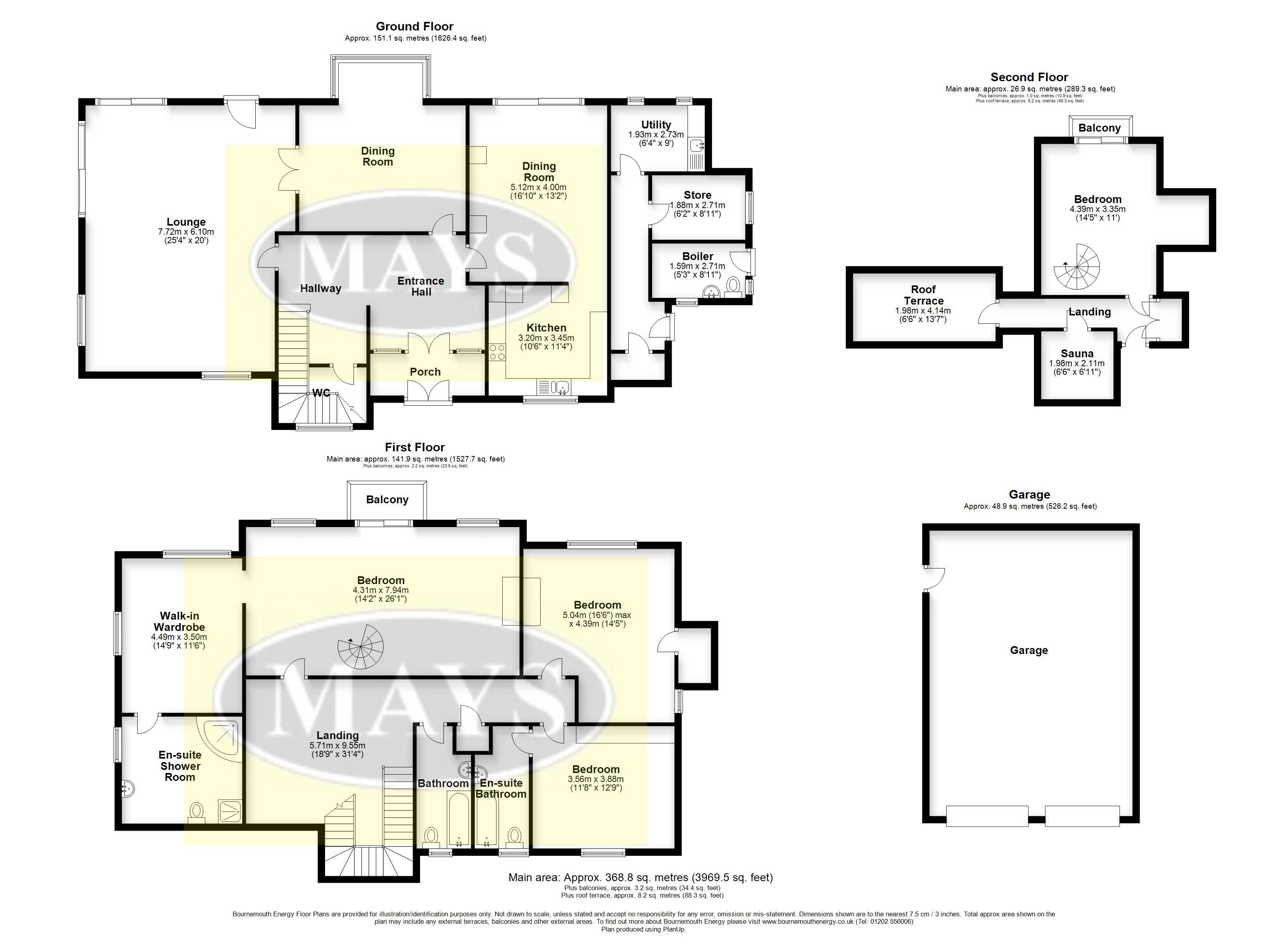 . 26’ Principal Bedroom with dressing room and en-suite Three further double bedrooms, . . . en-suite to guest bedroom Sauna and roof terrace with far reaching views