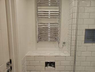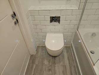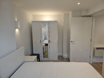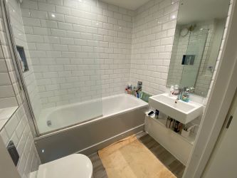 There’s a large airing cupboard that sits beside the separate bathroom which is subway tiled with a WC with a concealed cistern, a bath with a fully plumbed in shower and side screen and a wash hand basin.
