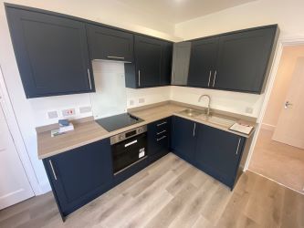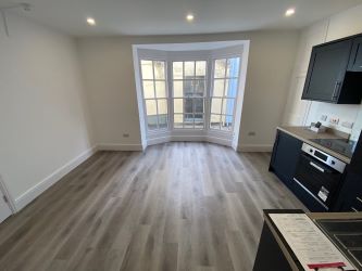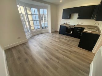 Recently refurbished throughout, the apartment is presented to a high standard and benefits from a new 250-year lease. Accessed via a secure communal entrance, the home opens into a light-filled living/kitchen space that combines comfort and style. The open-plan reception room features a classic Victorian multi-panel glazed bay window, offering wonderful natural light and views across Weymouth beach. There's ample space for both lounging and dining, making it a perfect place to relax or entertain. The sleek, modern kitchen is fitted with integrated appliances including a fridge/freezer, oven, and hob, and provides generous storage through contemporary wall and base units.