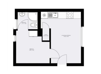 The front door opens into a spacious open-plan kitchen and living area. A double glazed window overlooks the rear aspect. The kitchen features a range of modern wall and base units, built-in electric oven, four-ring hob, cooker hood, and a washer/dryer. A freestanding fridge/freezer fits neatly into a recessed area. A clever, space-saving retractable breakfast table is integrated into a drawer unit. A generously sized storage cupboard is also located off the living space—ideal for bulkier items.