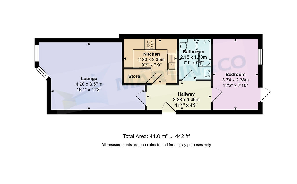The property also features a modern separate kitchen with gas hob, electric oven, ample storage, and space for appliances, alongside a contemporary bathroom with full-size bath, overhead shower, and stylish tiled finish. The bright lounge boasts a bay window and well-maintained flooring, while the double bedroom offers direct access to a communal outdoor space.