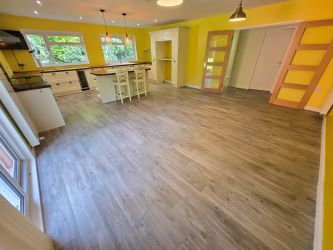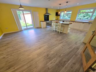 Originally constructed in the mid-1970s and thoughtfully extended, the property is well-presented throughout and offers a blend of modern convenience and rural charm. The accommodation centers around a large open-plan kitchen and dining area, featuring shaker-style units, oak-effect worktops, and quality integrated appliances including a range cooker, dishwasher, and drinks fridge. There is ample space for a large dining table, making this an ideal space for entertaining.