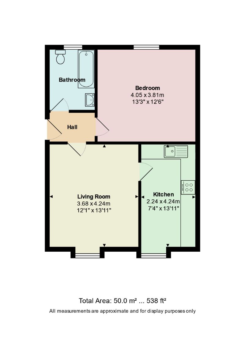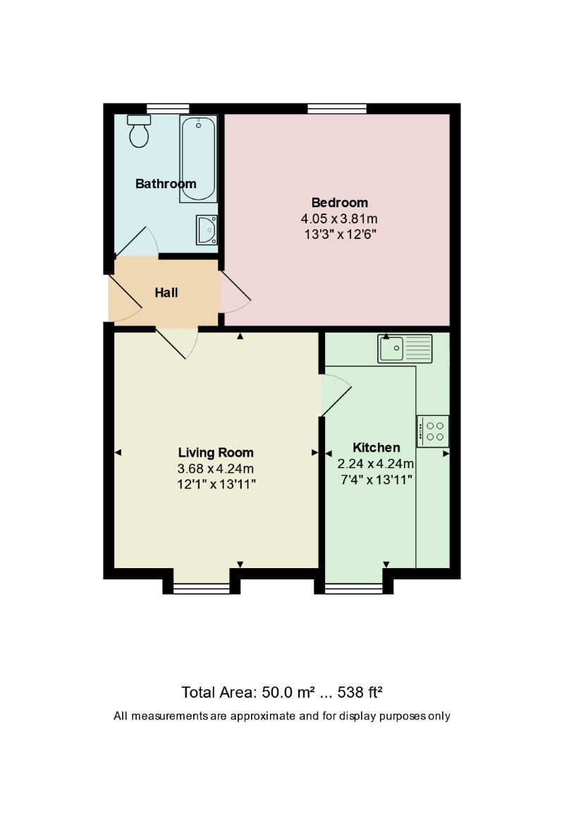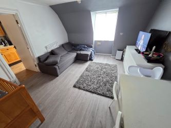 The modern kitchen and breakfast area provide ample storage and workspace, with room for essential appliances including a fridge/freezer and cooker. With thoughtful reconfiguration (subject to planning permission), the layout offers excellent potential for conversion to a two-bedroom flat, further enhancing its value and versatility.