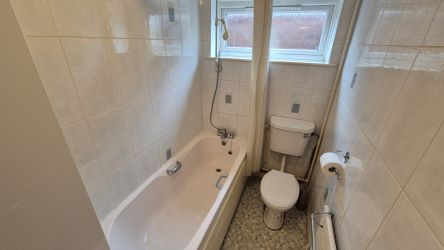 The bathroom is located between bedroom 2 and the kitchen. It features a white suite including a bath with a shower off the taps, a wash hand basin with a matching pedestal and a toilet. The room benefits from a high-level UPVC double glazed window with privacy glass, and a gas central heating radiator.