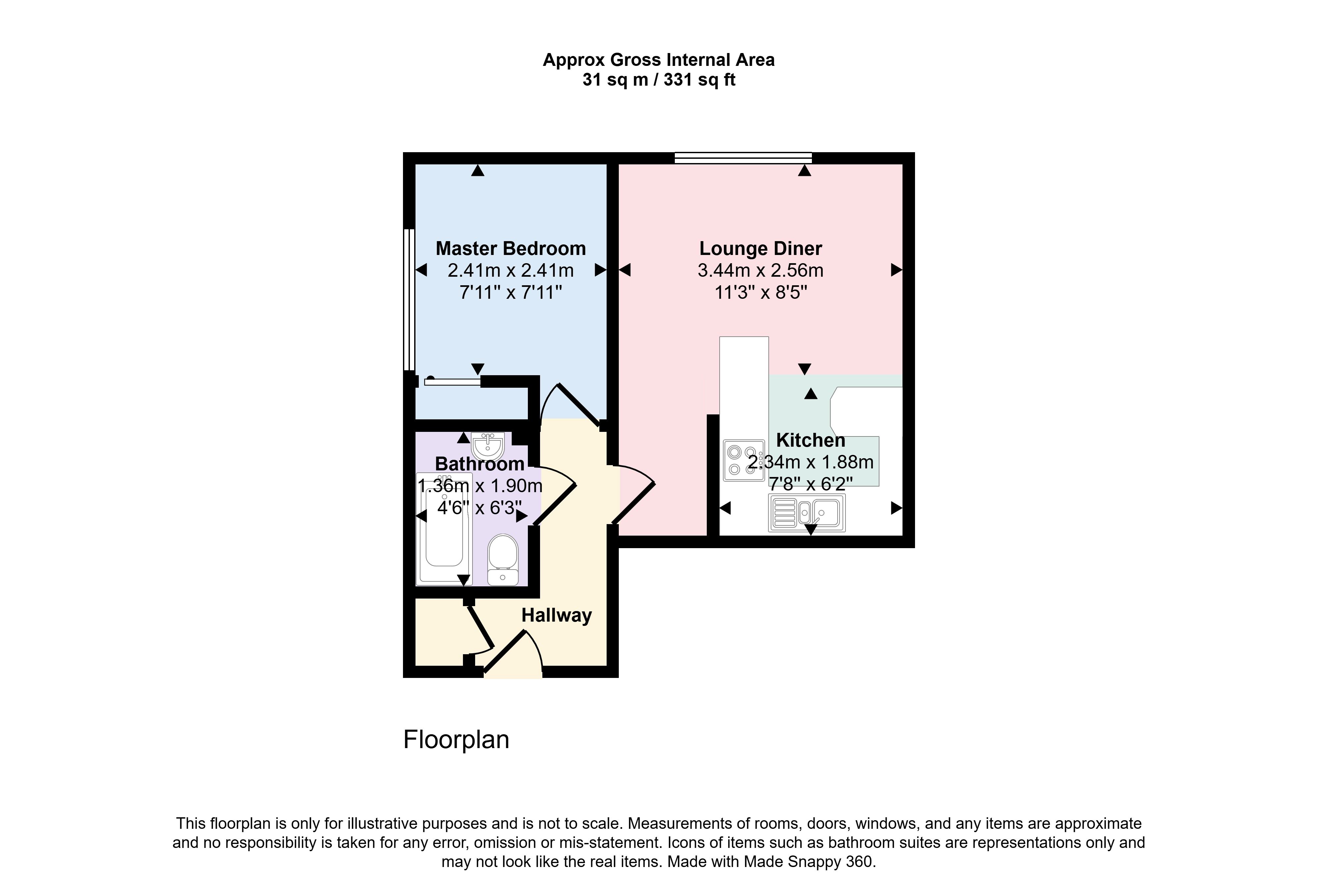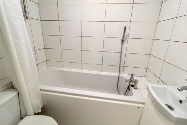 The bathroom comprises a bath with overhead shower, basin with storage, and additional hallway storage, which houses the water cylinder. The flat benefits from electric heating and an intercom system.