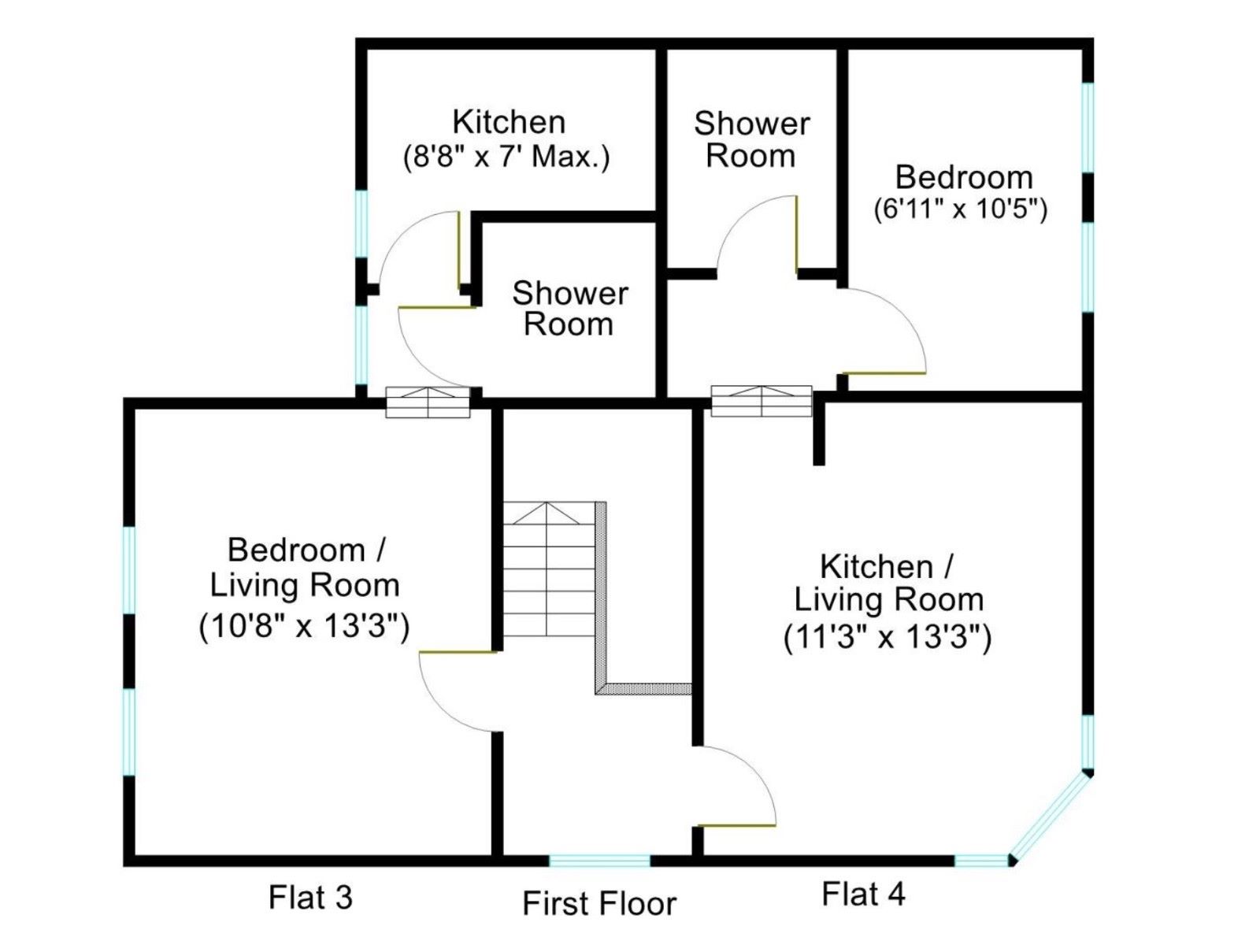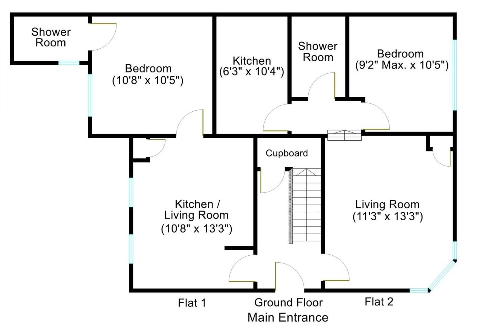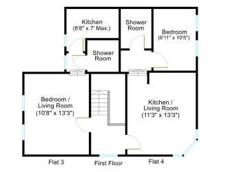 Front door opening to communal entrance with doors opening to flats 1 & 2. Staircase to first floor landing with doors opening to flats 3 & 4.