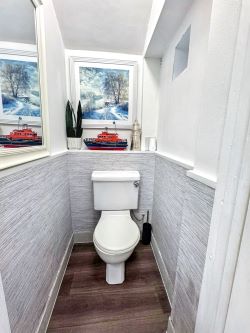 The bathroom and WC have recently been modernised, including the addition of a shower cubicle. Hot water has been installed at both the washbasin and in the kitchen, which also includes a washing machine, fridge, and tumble dryer.
