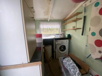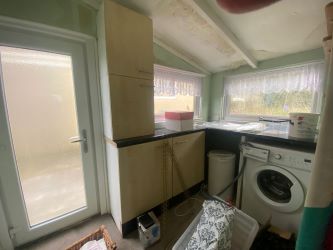 Double glazed back door leading out to one of the driveways and parking and around to the back garden. Range of floor and wall mounted cupboards, worktop over, space for automatic washing machine, two double glazed windows and shelving.