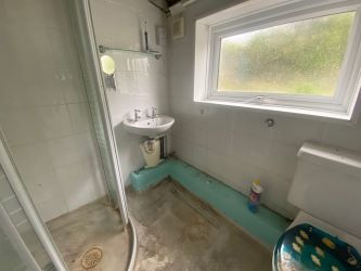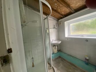 Obscure glass double glazed window. Low level WC shower cubicle and wall hung sink. Tiled walls.