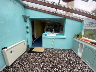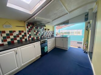 Double glazed window and Velux window above. Range of floor and wall mounted cupboards with worktop over incorporating sink and drainer. Space for cooker and fridge/freezer. Further night storage heater. Door into an inner hallway and a separate door into:-